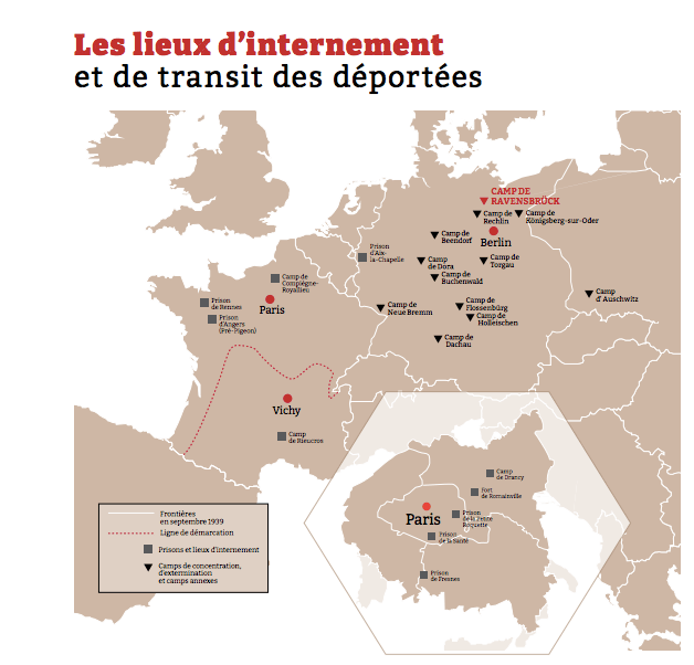 Source « Mes Grandes vacances, Marguerite Lévêque » Au départ de Ravensbrück, convoie en camion vers Berlin jusqu’à la frontière Suisse puis en train, lac de constance, Genève, Annemasse, Lyon puis Paris (voir carte ci-dessous).